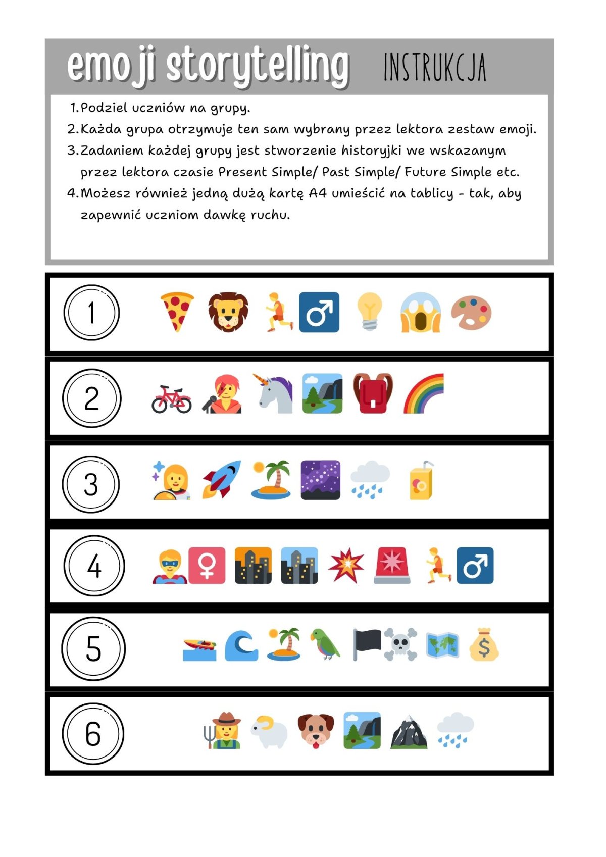 instrukcja + 15 kart A4 z emoji - wieszasz jeden zestaw na tablicy a zadaniem uczniów jest utworzenie historyjki wyznaczonym przez Ciebie czasie.